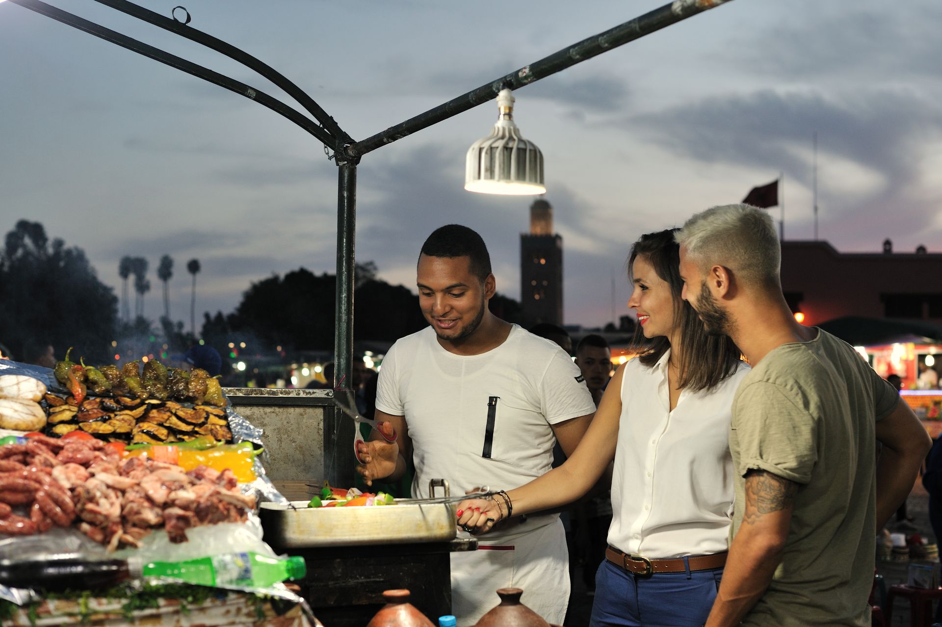Immerse yourself in the lively atmosphere of Marrakech's bustling night markets. This captivating scene showcases friends enjoying a flavorful selection of freshly grilled delicacies under the evening sky, with the iconic Koutoubia Mosque in the background. Perfect for food lovers seeking an authentic taste of Moroccan culture.