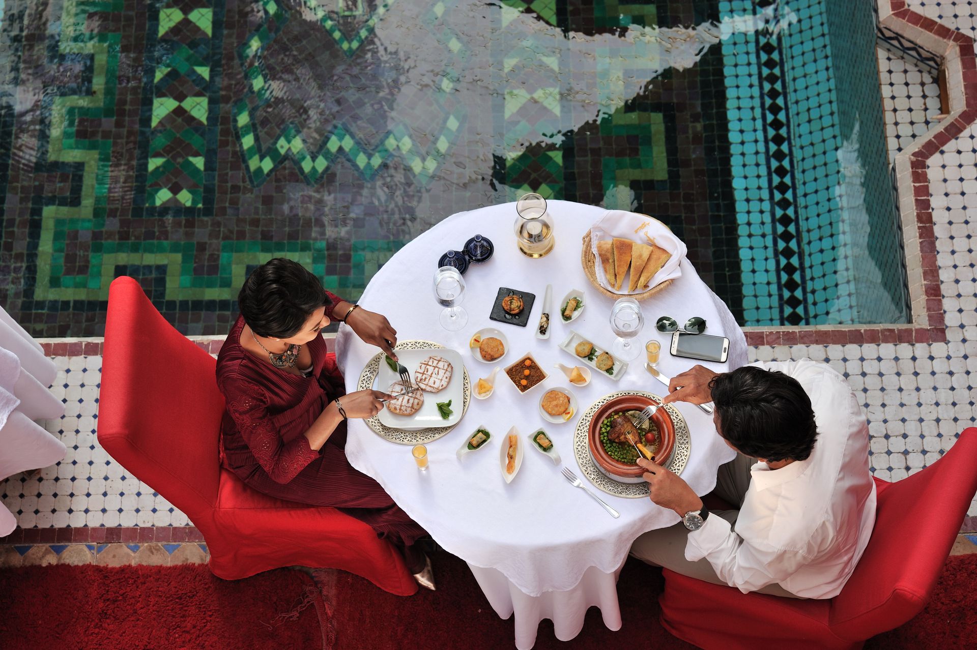 Indulge in the refined flavors of Moroccan cuisine in an exquisite setting by a traditional tiled pool. This photo captures the essence of dining in luxury, featuring beautifully presented dishes, fresh bread, and vibrant spices, perfect for an unforgettable culinary journey.